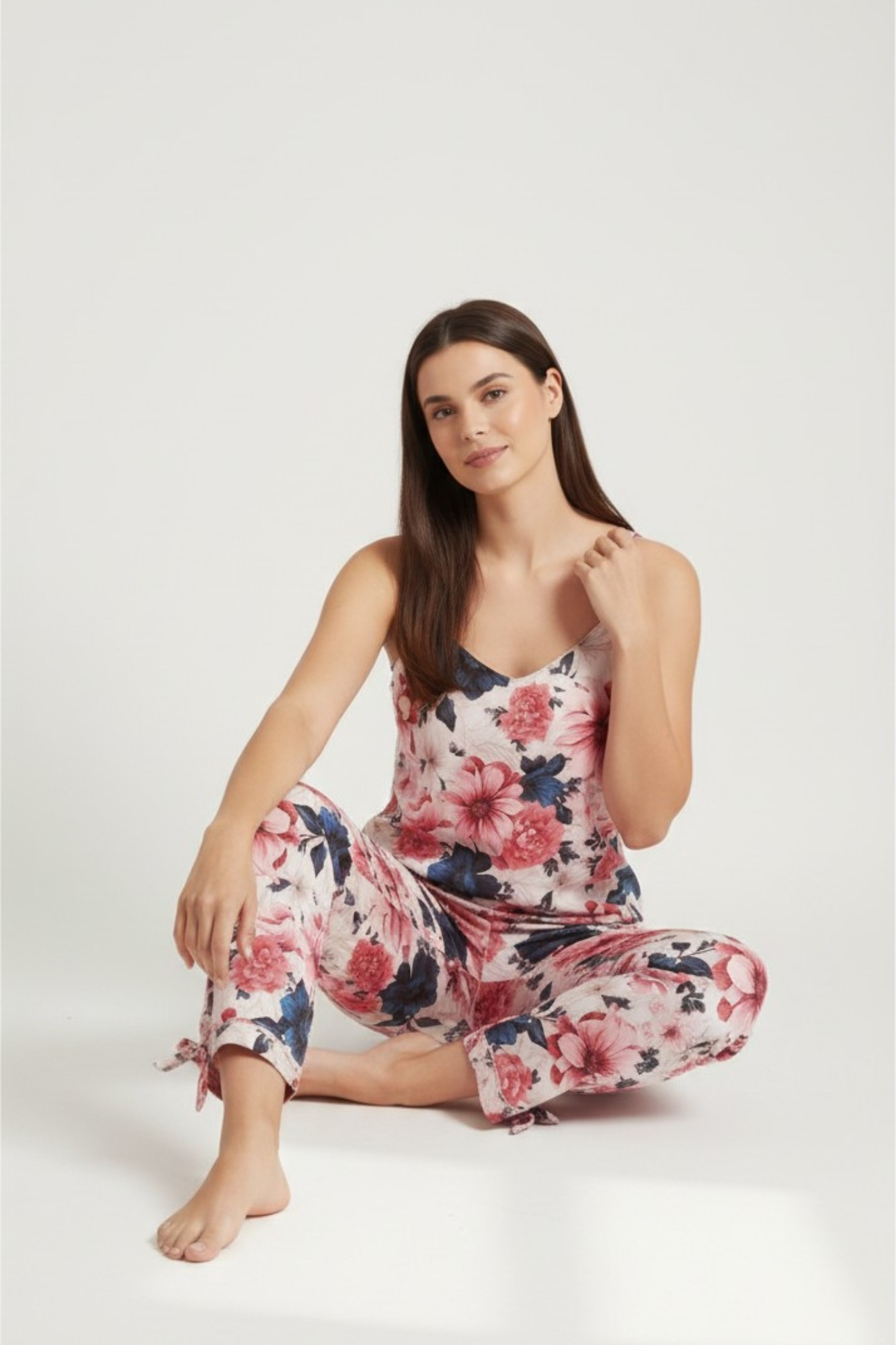 Nuestra pijama de flores esta elaborada en una tela suave y lo mejor no se arruga, pantalón con bolsillos laterales y en la bota un detalle de amarre, blusa con tirantes graduables.