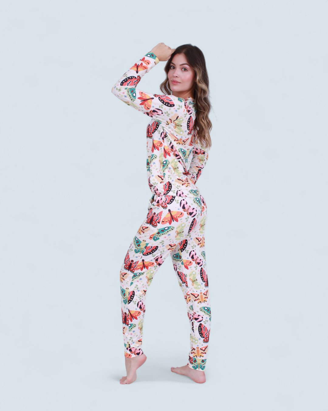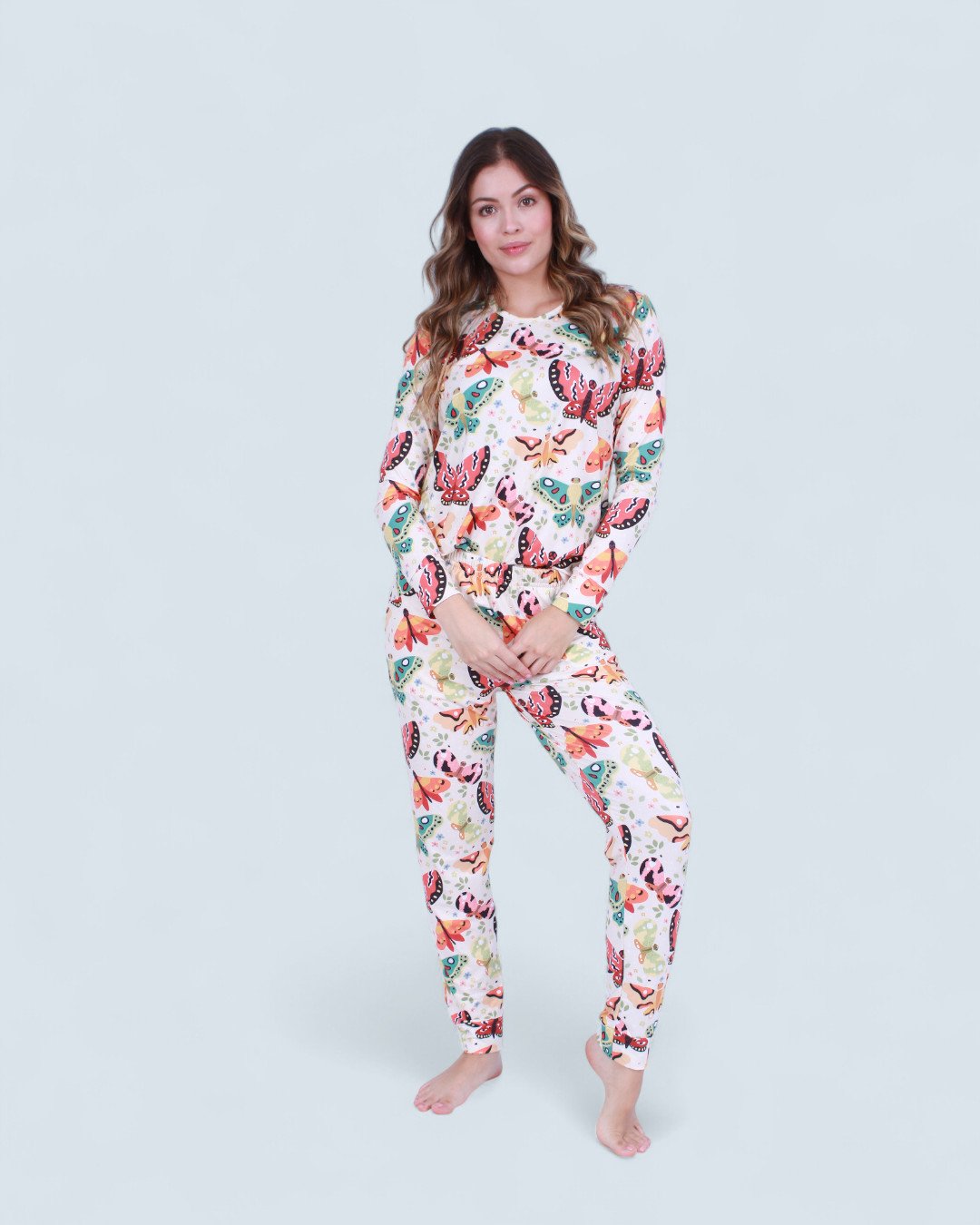 Pijama Mariposas, ésta linda pijama esta hecha en piel de durazno, una tela muy suave y elástica que se adapta fácilmente a la figura.