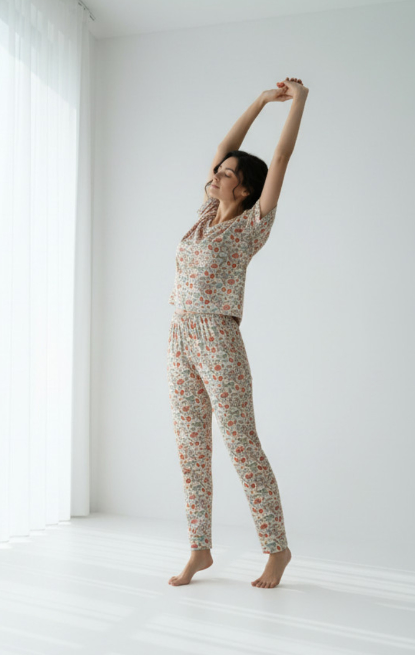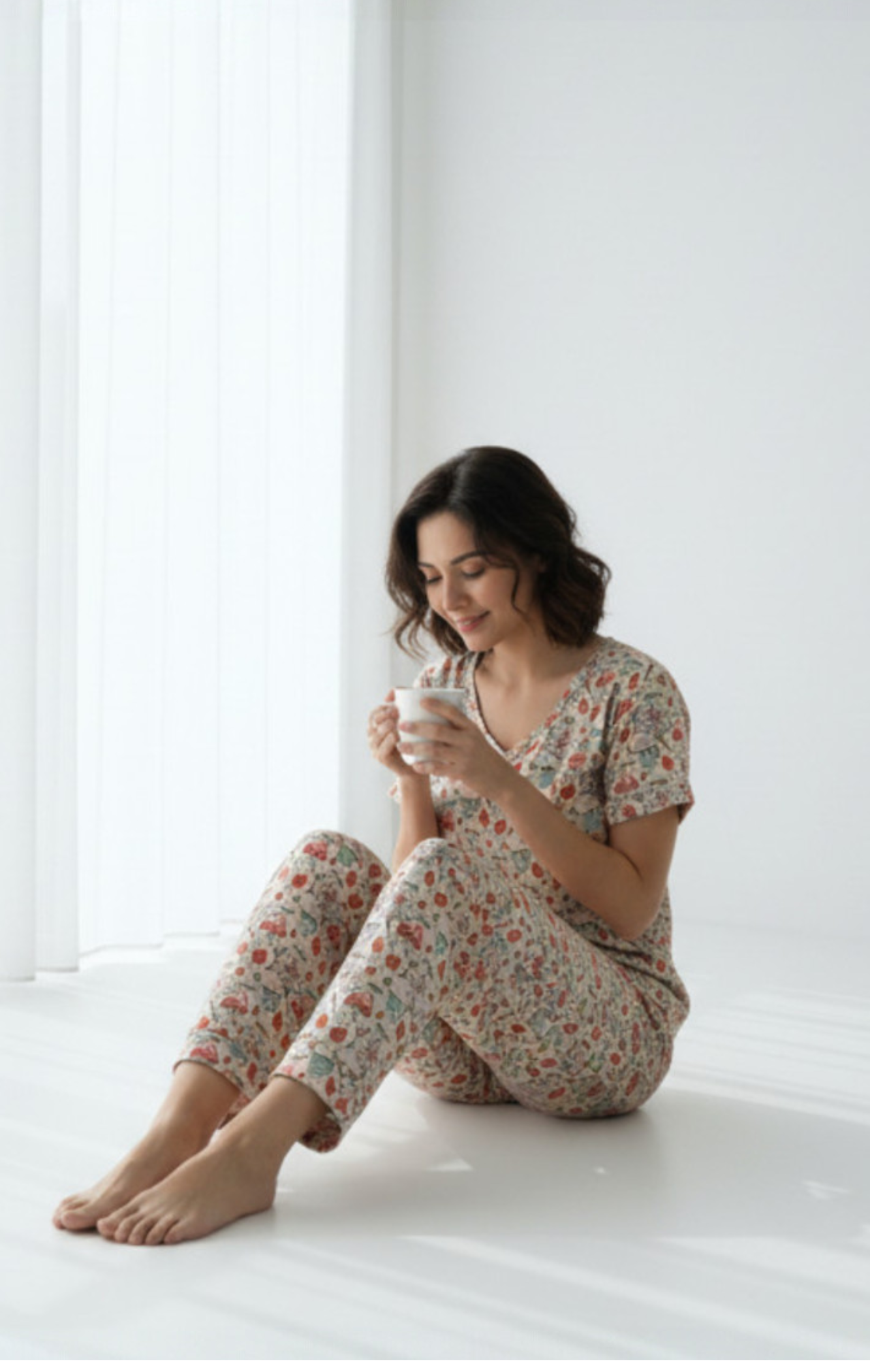 Su diseño son pantalón largo  y camiseta de manga corta la hace ideal para climas cálidos o para quienes aman sentirse cómodas sin perder el toque femenino. El estampado sutil y encantador aporta un aire relajado y natural, perfecto para esos momentos de descanso en casa.