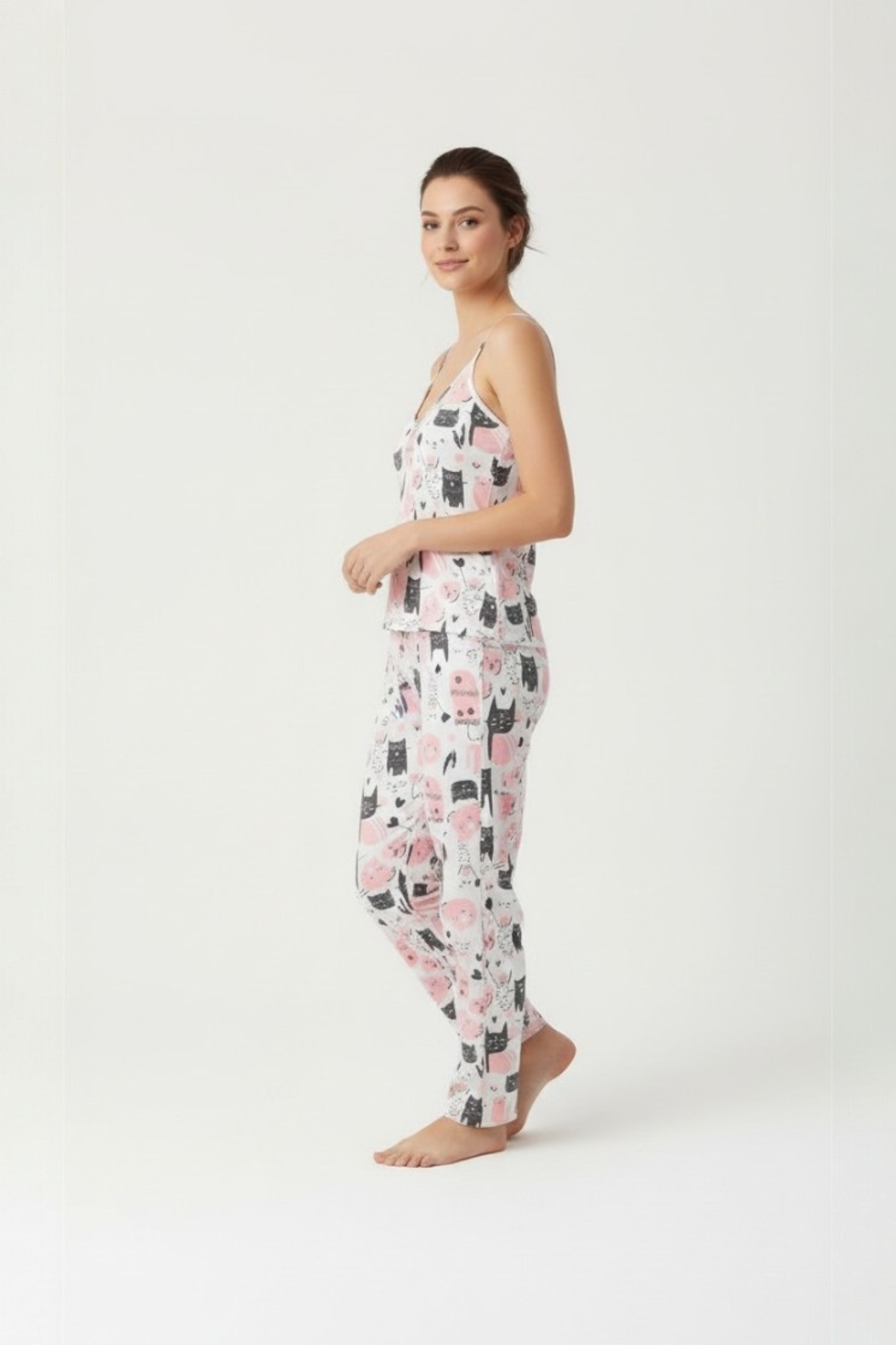 Pijama piel de durazno tiras ajustables, pantalón largo con bolsillos laterales, estampado gaticos