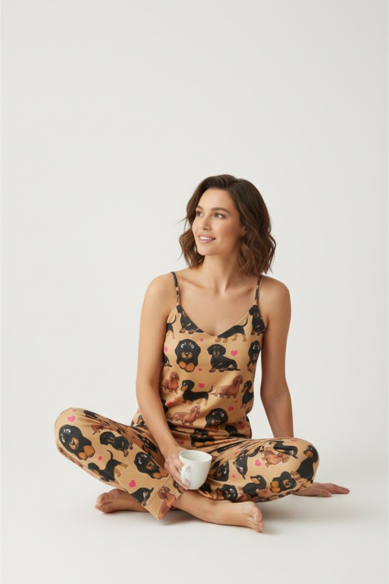 Pijama piel de durazno tiras ajustables, pantalón largo con bolsillos laterales, estampado perritos salchicha