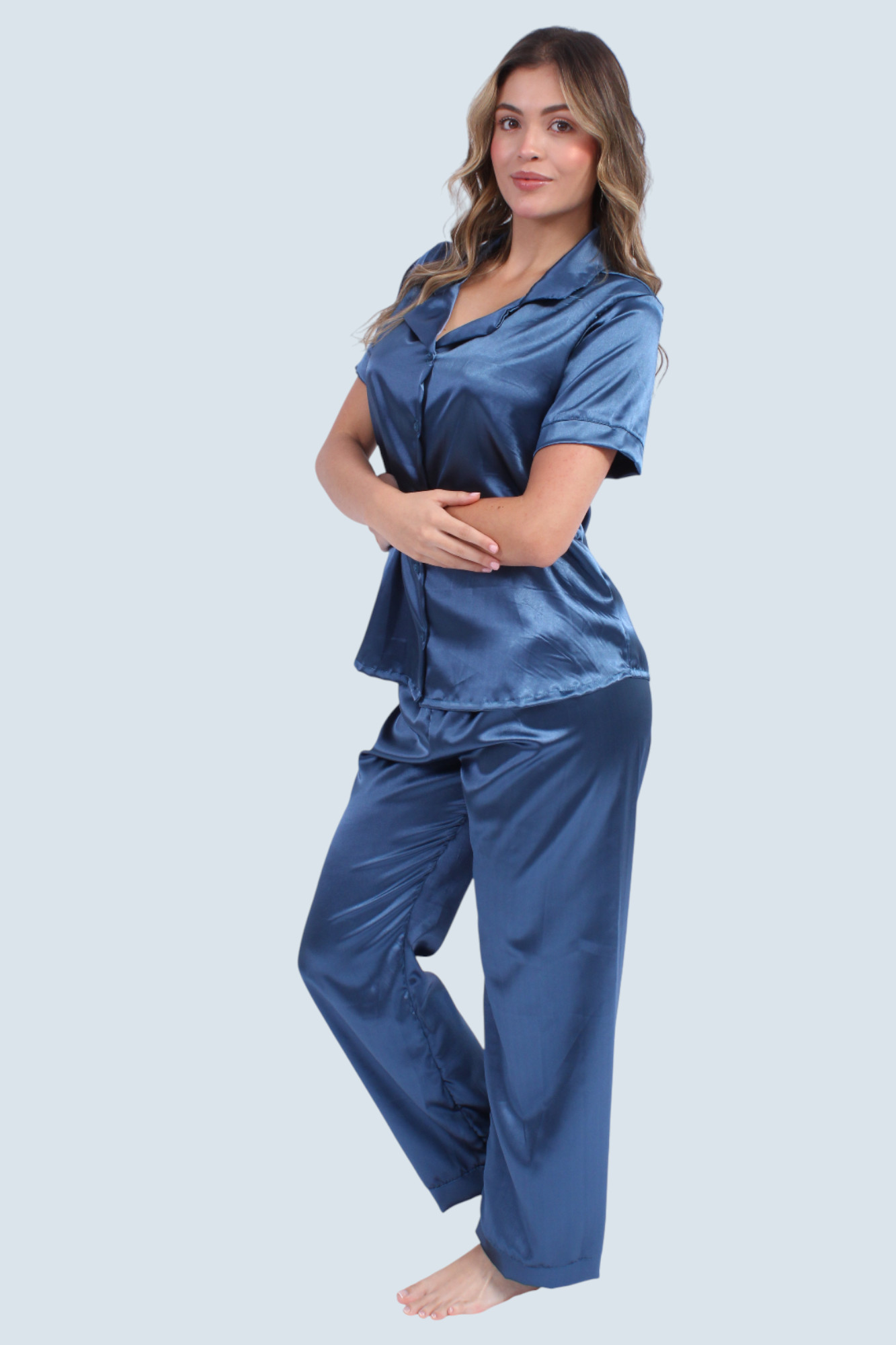 Pijama en Satín para mujer, pantalón largo, tela suave y elegante.