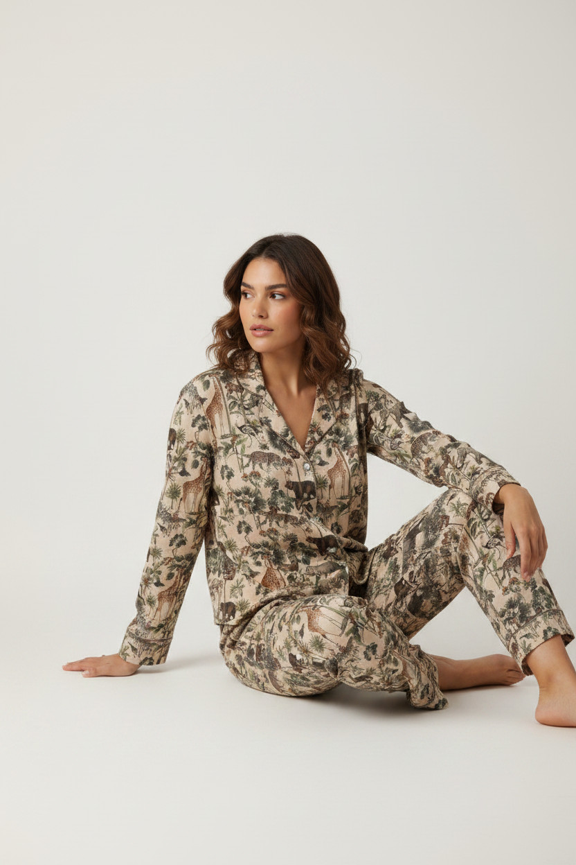 Pijama Selva, ésta linda pijama esta hecha en piel de durazno, una tela muy suave y elástica que se adapta fácilmente al cuerpo.