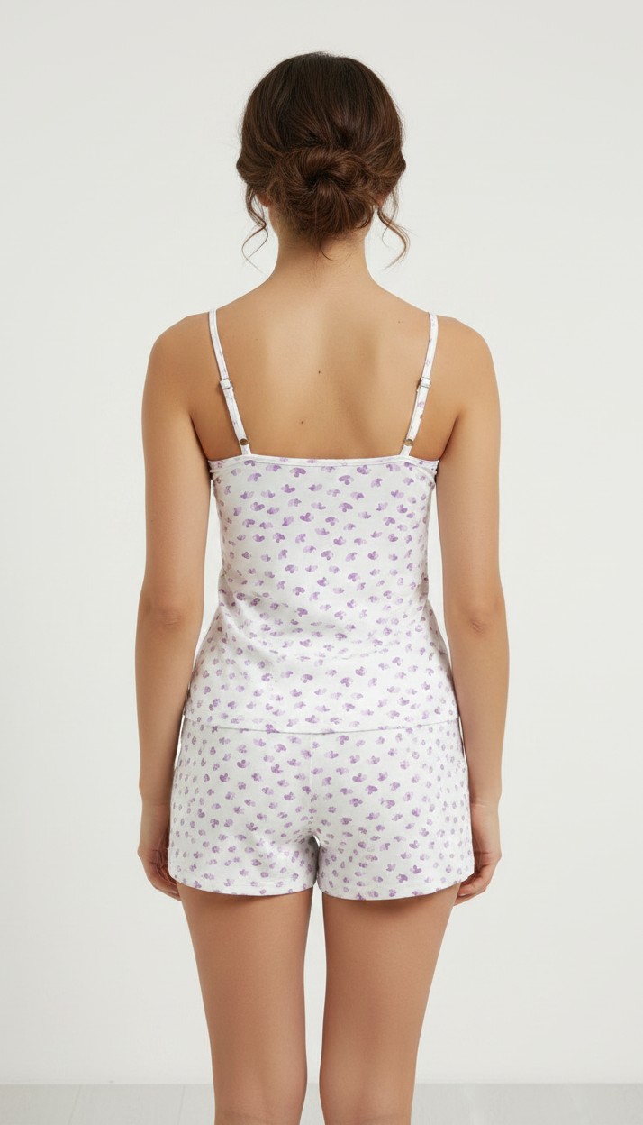 Diseño: Camiseta de tiras ajustables y short corto con delicado estampado floral/corazones en tono lila.